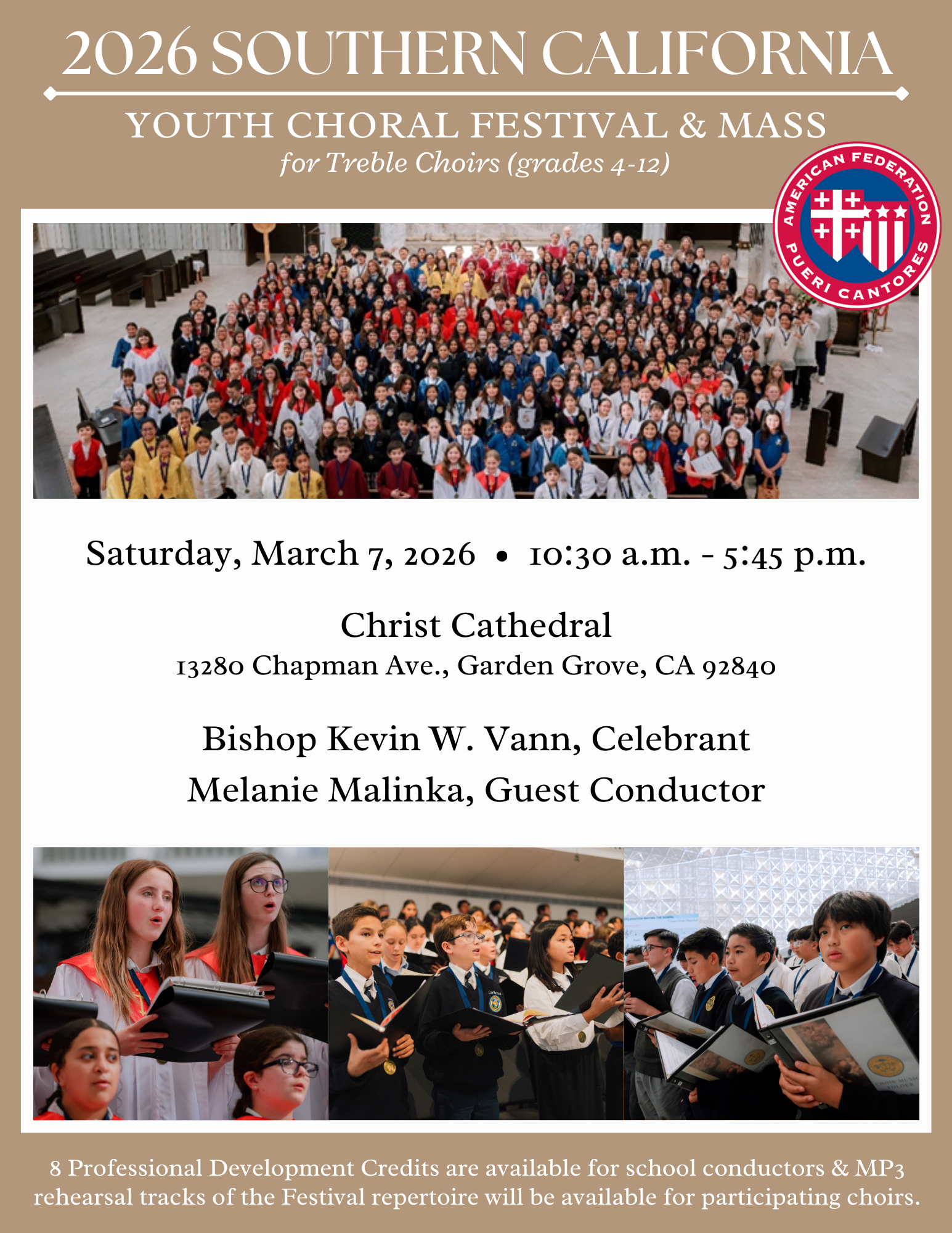 Click on the image below to download the 4-page 2026 Pueri Cantores Southern California Catholic Youth Choral Festival & Mass ebrochure for complete festival details including repertoire, schedule of the day, registration details, and more.